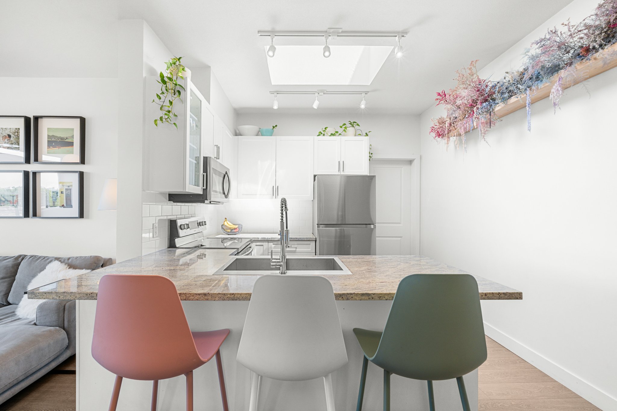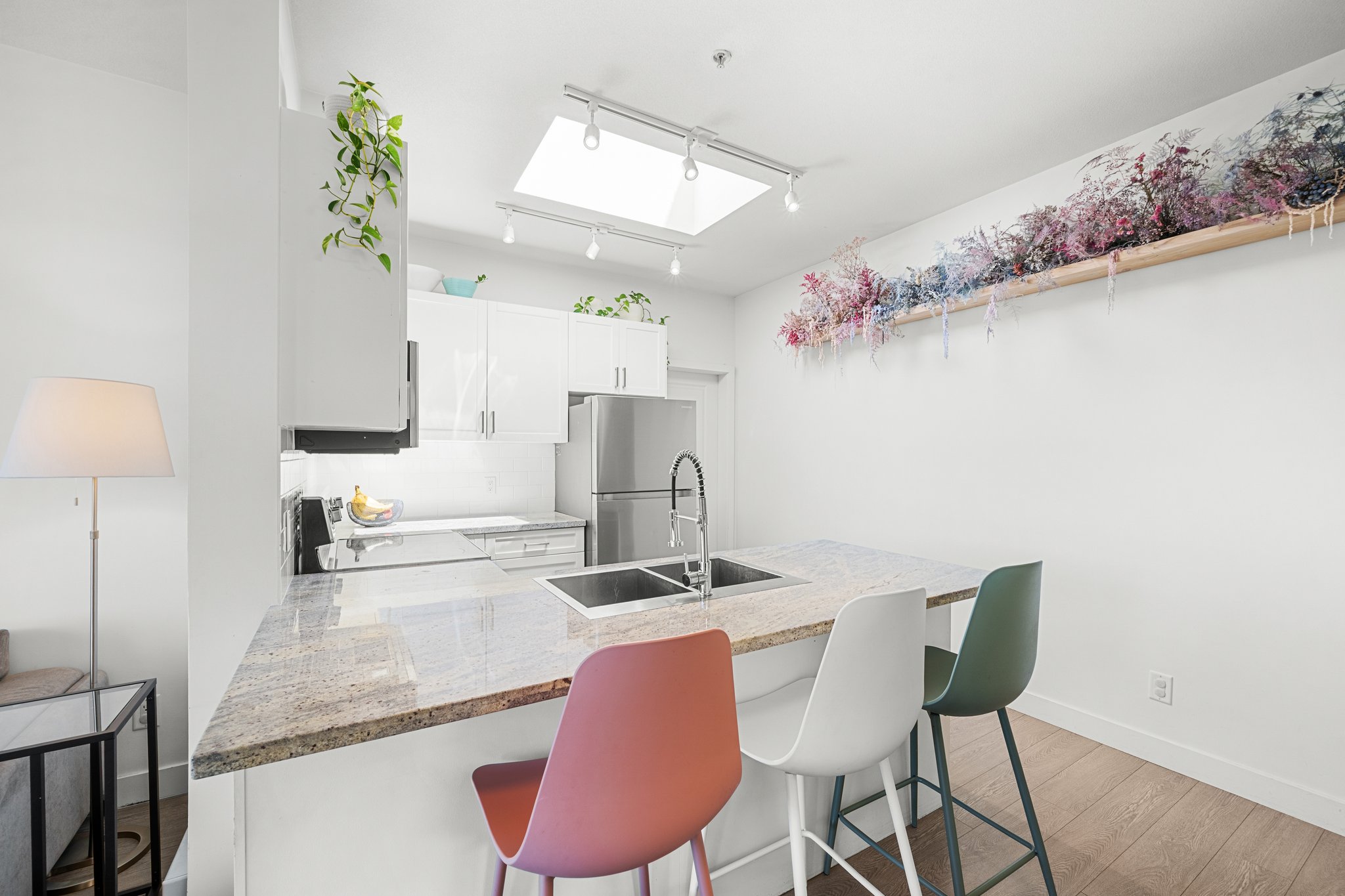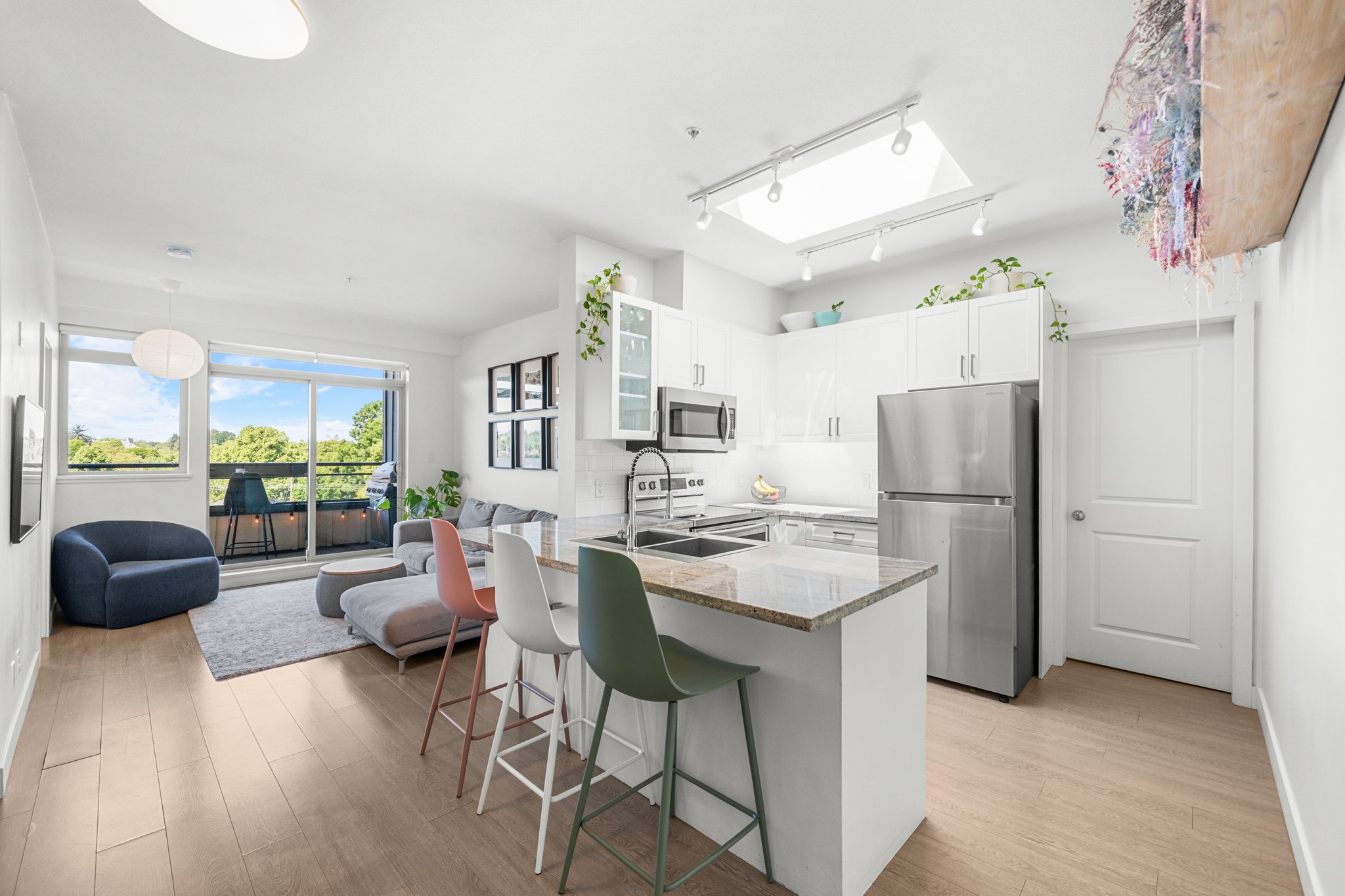 PENTHOUSE PERFECTION IN FRASER! Bright, airy 2 bed + 1 bath top-floor home in one of Vancouver’s most vibrant neighbourhoods and on the quiet side of the building! Enjoy higher ceilings, huge west-facing windows, and a private balcony with stunning mountain & sunset views. The kitchen features a skylight, granite counters, and stainless appliances. Spacious primary bedroom with walk-in closet & access to a spa-inspired bath with deep soaker tub. The second bedroom is perfect for a nursery, guest room, or home office. Located in a boutique, well-managed building just steps to Fraser & Mount Pleasant’s best cafes, shops & eats. Pet Friendly!1 secure parking space included. This is penthouse living at its best—book your showing today! Open House Saturday(14) / Sunday(15): 1-3pm!